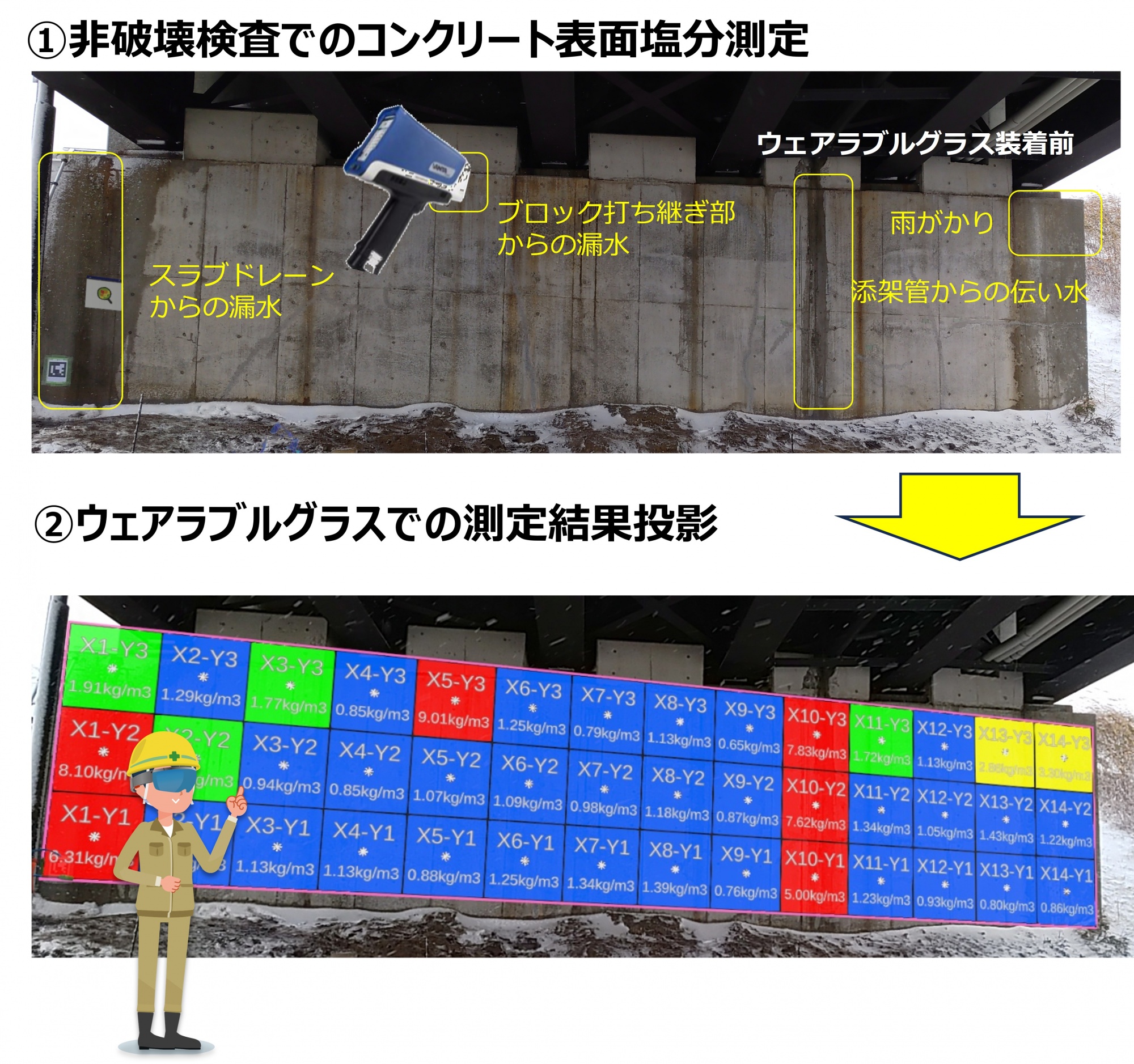 - Before:チョーキングにより塩分濃度測定予定場所を指定し、ドリル削孔によりサンプル粉末を取得し、化学分析により塩分濃度を測定