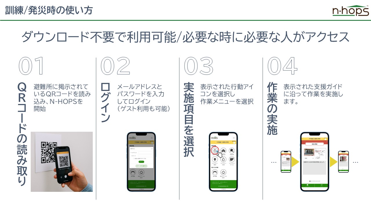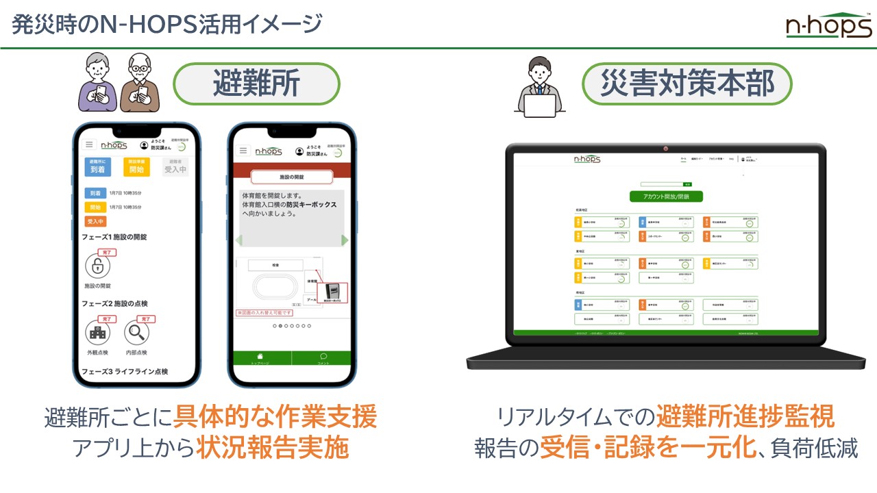 「N-HOPSは」地域主体の避難所開設・運営、訓練をサポートするWebアプリケーションです。