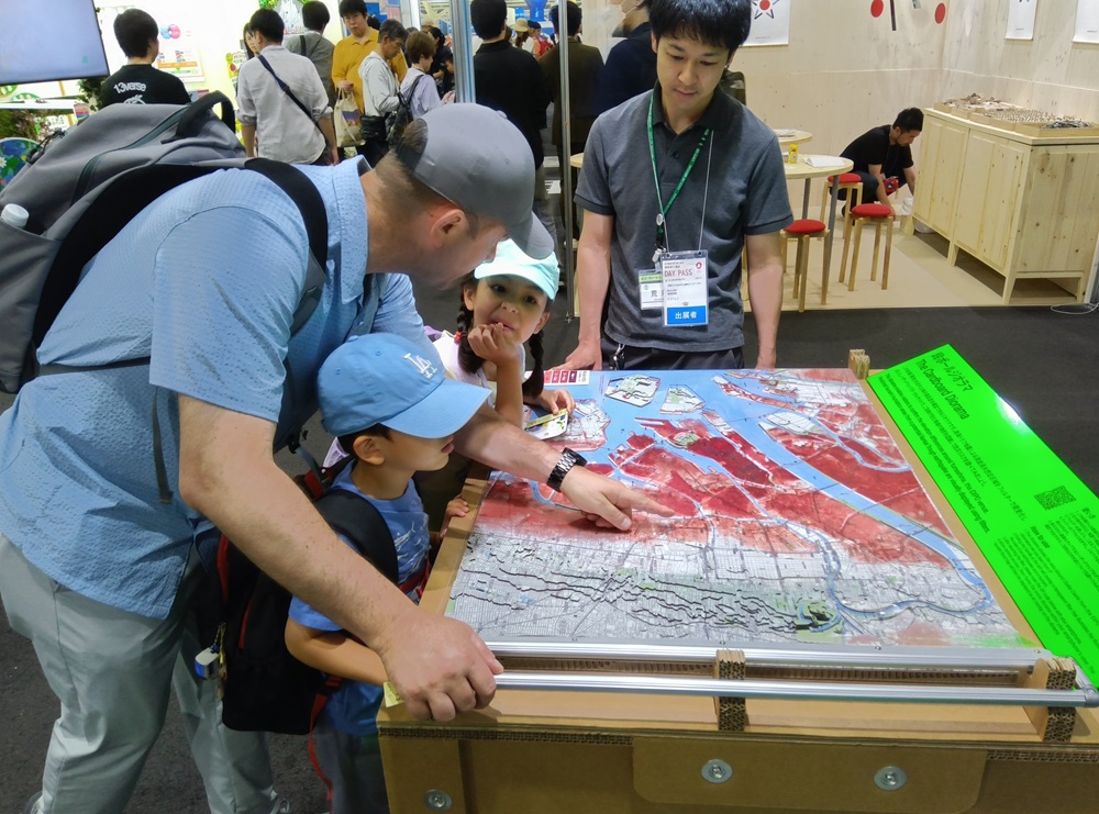 等高線に沿ってカットした段ボールをパズルのように積み重ねることで、地域の地形や土地の高さを直感的に理解できる組立式のジオラマ。ブースでは、大阪市街地(万博開催地周辺)をハザードマップ等と重ね合わせ、ARを活用して表示することで、災害リスクを視覚的に体感いただきました。