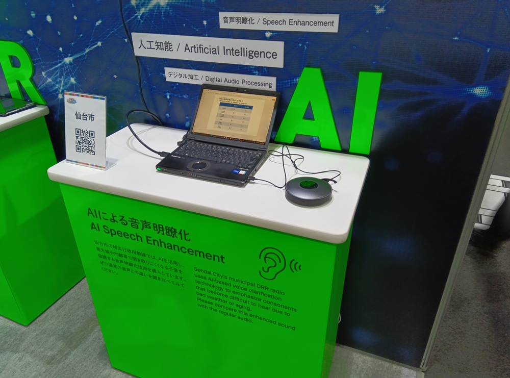 屋外の騒音や天候、加齢による聴力の低下等の要因により、高い音(子音)が聞き取りにくくなるという課題の解決のため、AI技術を駆使し、音声を強調し、明瞭にするソリューション。本市では令和5年3月に導入しており、ブースでは、音声の聞き比べを来場者にしていただきました。