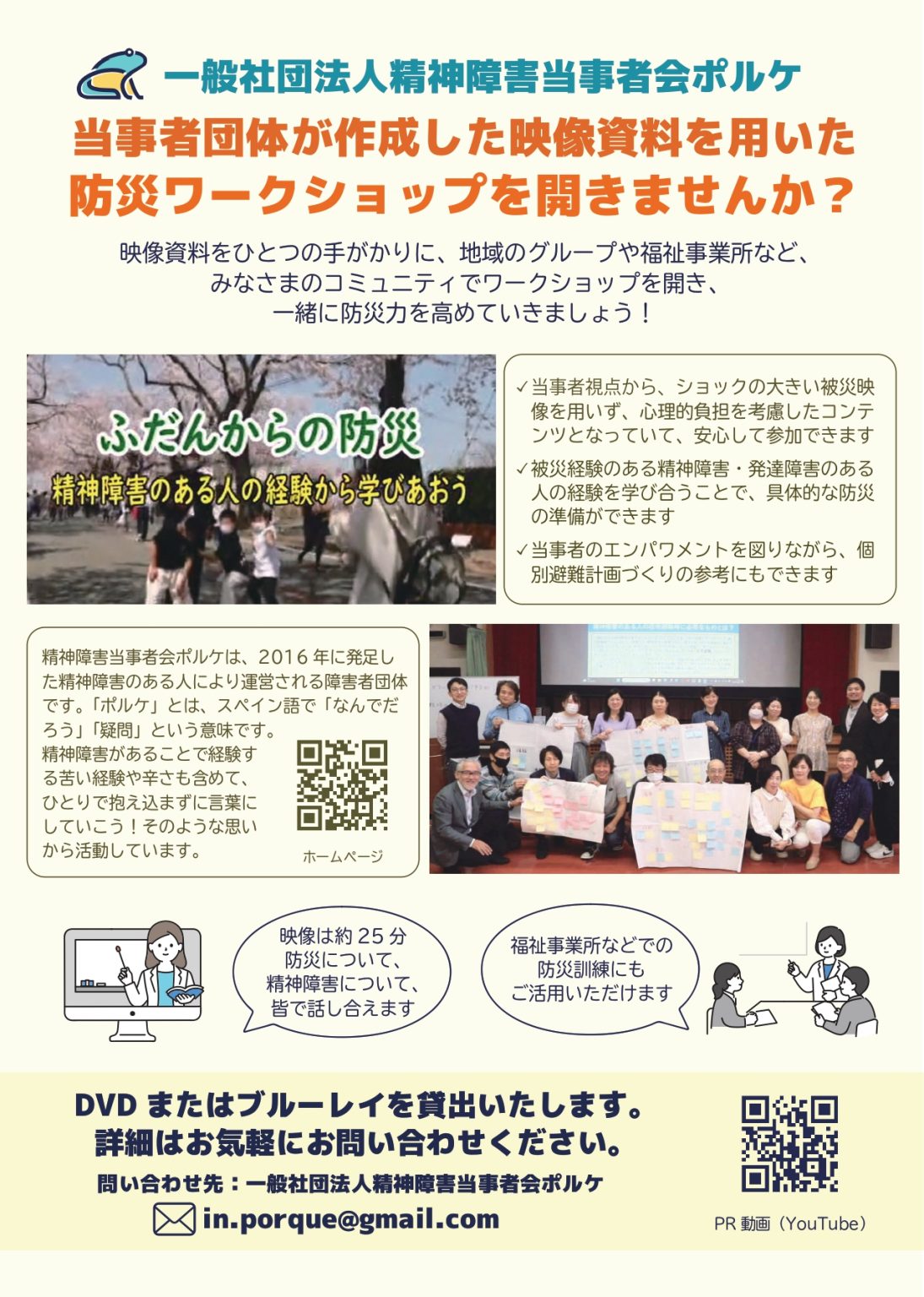 防災ワークショップや研修でご活用いただける映像資料「ふだんからの防災 ― 精神障害のある人の経験から学びあおう ―」の貸し出しについてのご案内です。