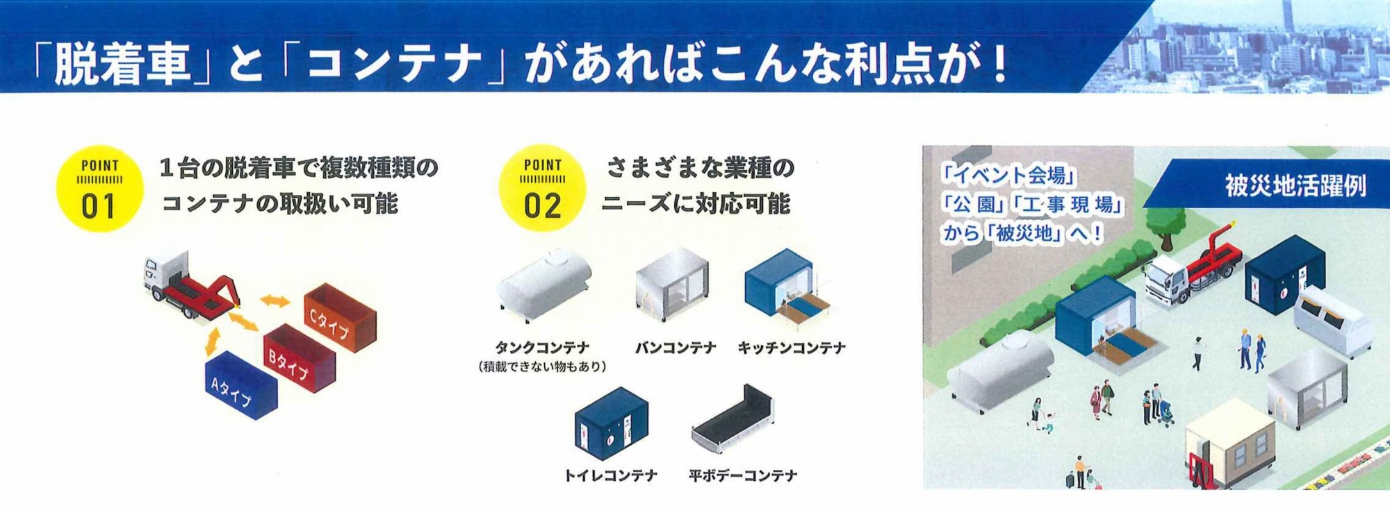 平常時は廃棄物収集運搬用コンテナを搭載・運搬している脱着車を、災害発生時には『防災コンテナ』の輸送車両として活用できることが特徴です。