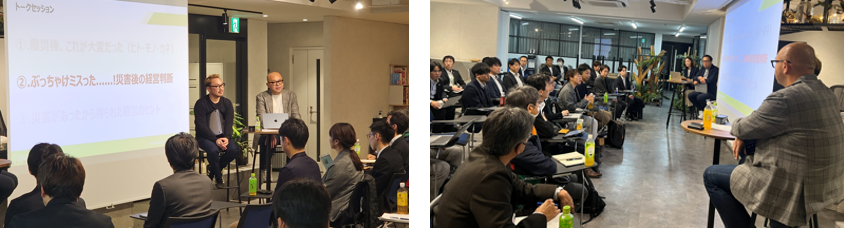 トークセッション前半では、発災直後に企業が直面した混乱や困難について、登壇者それぞれの実体験をもとに話が展開されました。まず、登壇者からは、「家族の安否が確認できたからこそ社員が出社し、業務を継続することができた」というエピソードが語られました。この話を通じて、災害時の対応やソリューション開発を検討する際には、従業員の家族まで含めて考えることが重要であるという視点が示されました。また、ビルオーナーである登壇者からは、「テナントが家賃を払えない状況に陥った際、家賃を免除する判断をしたことで、結果として入居率の維持につながった」という話があり、その判断が事業継続に与えた影響の大きさについて、具体的なエピソードを交えて語られました。