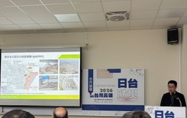 1月30日(金)、日本台湾交流協会および国立陽明交通大学の共催により、高雄にて「日台災害リスク軽減カンファレンスin高雄2026」が開催されました。日本と台湾の防災分野における経験や技術を共有し、双方の災害対策に生かすことを目的としており、高雄や台南など台湾南部の自治体、企業などを中心に来場されました。