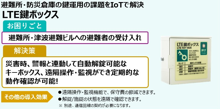 災害時、警報と連動して自動開閉可能な「LTE鍵ボックス」