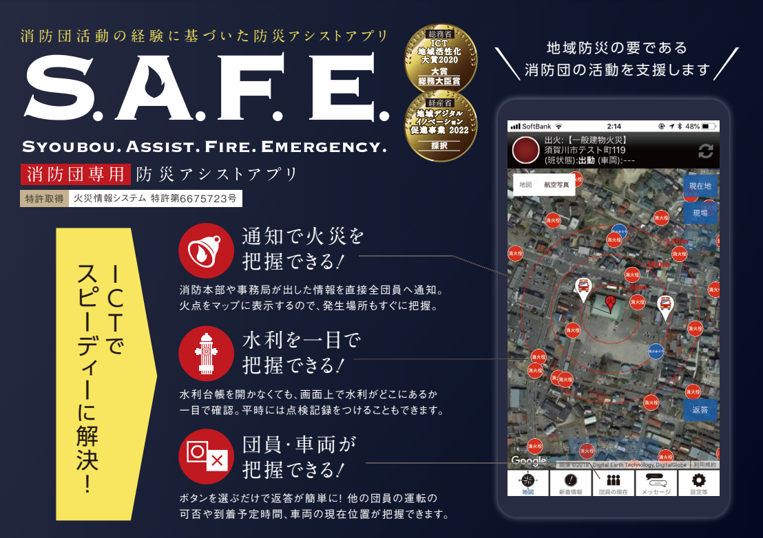 【消防団専用・防災アシストアプリS.A.F.E】は、消防団のための防災アシストアプリです。